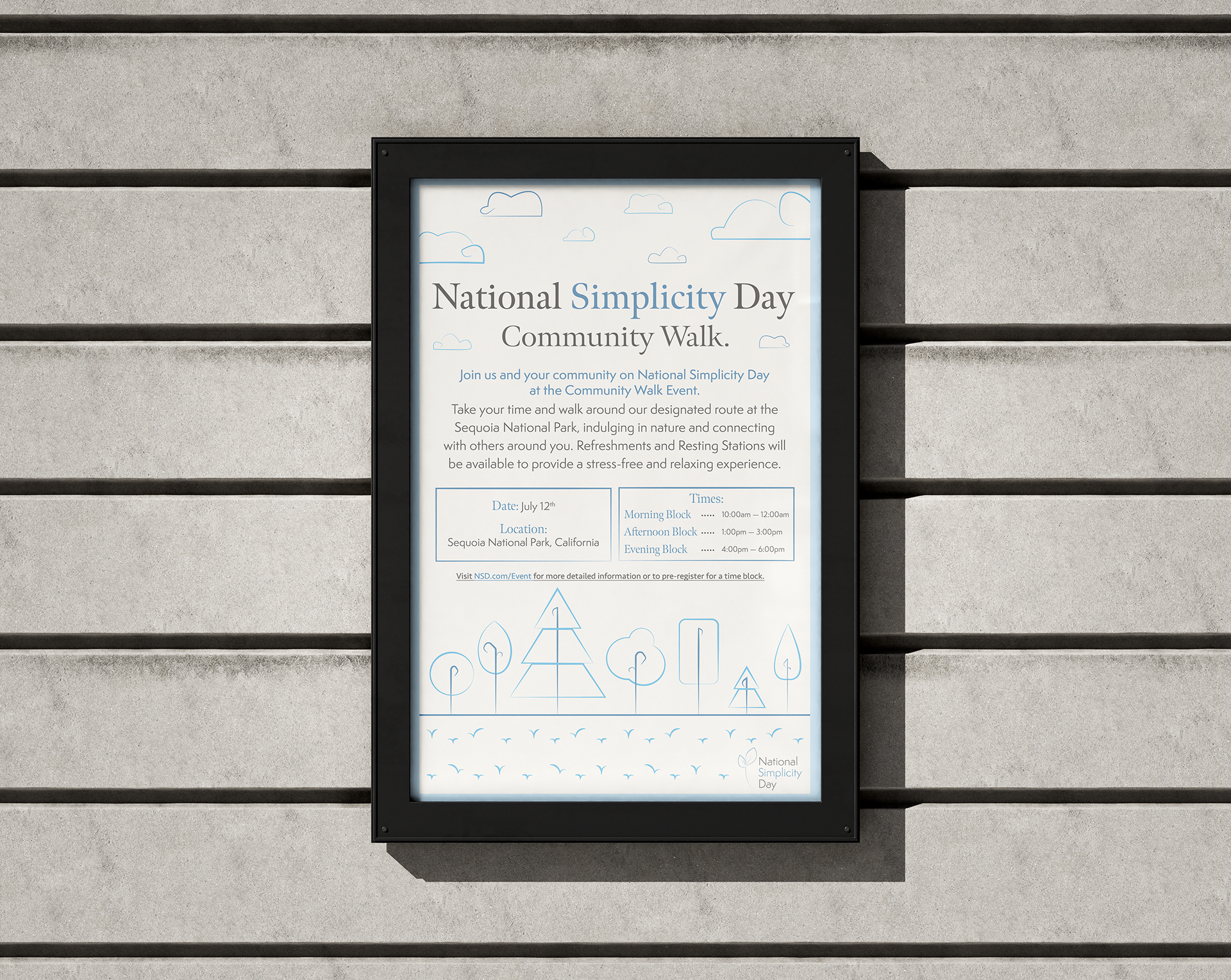 The Community Walk Event is a campaign set on National Simplicity Day. In order to motivate others to take a step away from their work and reconnect with others and nature, the event takes place at the Sequoia National Park, which would involve participants traveling to the park to walk around and enjoy something new.
